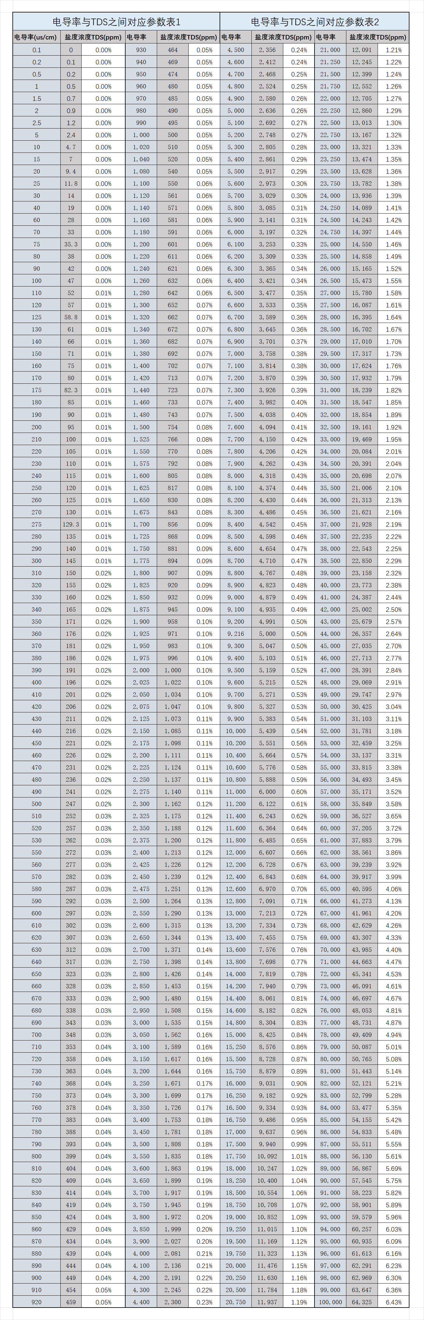 普遍认为电导率与TDS的换算关系为电导率是TDS的2倍,而实际上那个只是大概值,表中所给的也是经验值,TDS和电导率是个非线性关系。